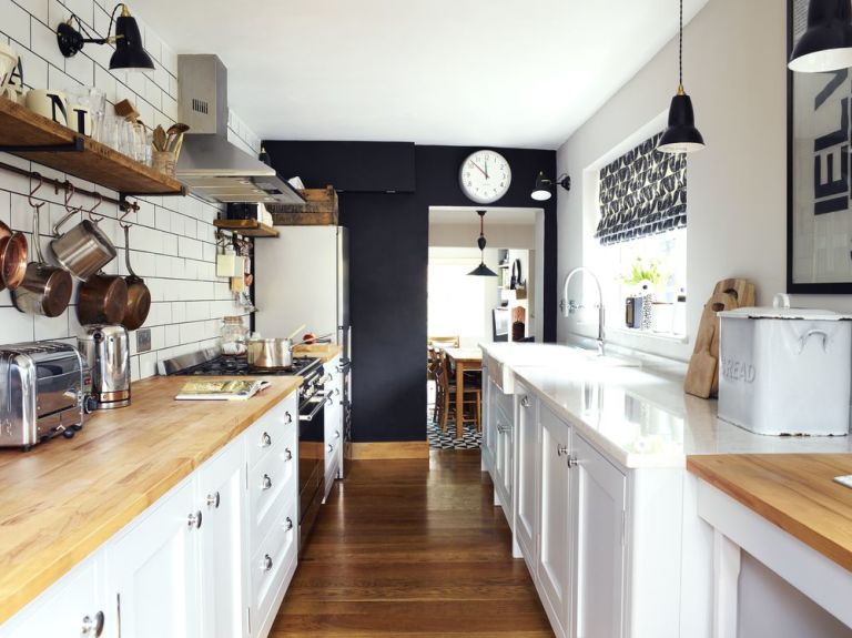 С внимателното планиране кухнята галерия не трябва да се чувстват претрупана, Използвайте смесица от материали и покрития, стъклени стени или отворени рафтове.