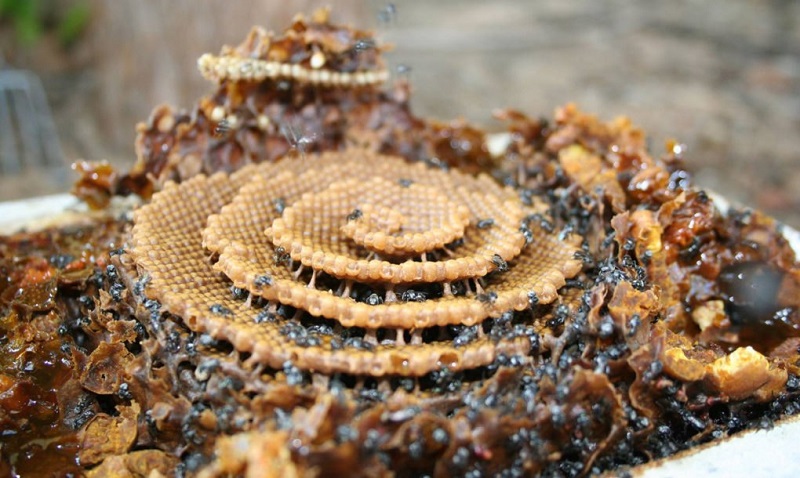 Известни като „захарни пчели“, Tetragonula carbonaria живеят в Австралия и създават необичайни еднопластови спираловидни кошери, които са напълно различни от плоските кошери. Всеки кошер има само по един вход, който е покрит с лепкав слой помагащ за прихващането на патогени, за да се предотврати навлизането им в кошера.